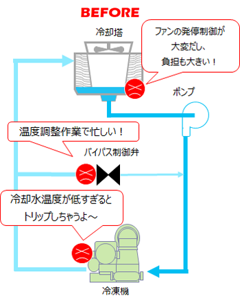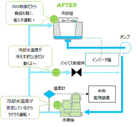 2023年度の設備効率化として、冷却塔ファンのインバータ化を行いました。冬期に定格運転していたファンの電力削減となり、冬場の冷却水温度を一定にするためにこれまではバイパス弁を使っていましたが、インバータの導入によりバイパスすることなく一定の温度に制御可能となりました。