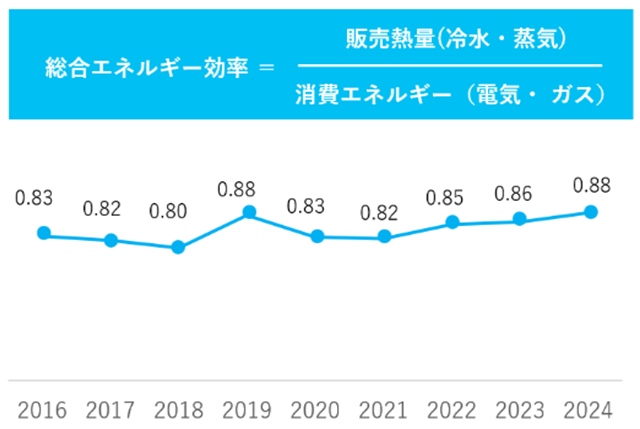 2010年より以前は0.60程度であった総合効率は、大規模更新工事や供給区域の見直し等を経て、2024年度は0.88となり、省エネ法の事業者クラス分け評価制度においてAランクを取得しています。