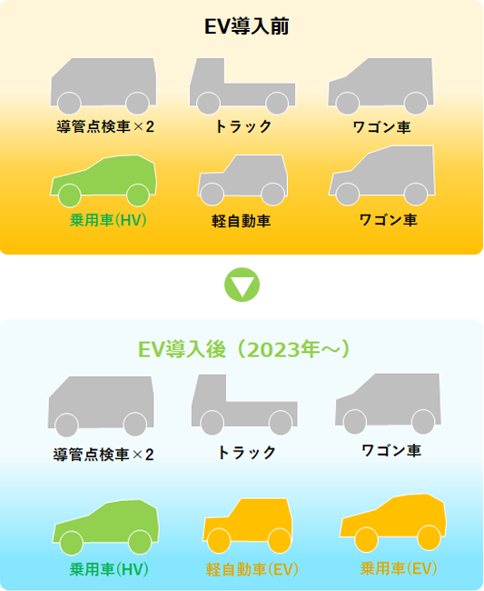 温室効果ガス排出量削減のための手法の一つとして、業務用車両を環境負荷の低い車両への更新を計画しています。年間の走行距離、燃料使用量、経過年数などを考慮した更新計画を策定し、順次入れ替えを行います。特に、走行時にCO2を排出しないZEV※への転換を積極的に進めてまいります。