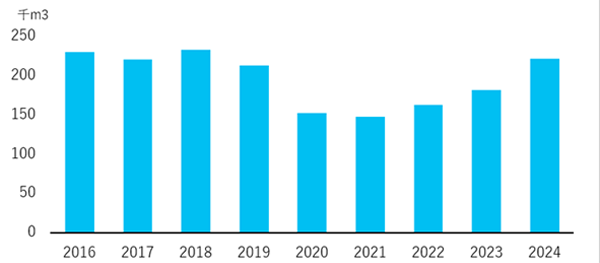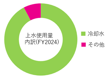 上水使用量のうち、冷却塔における冷却水の蒸発およびブローが大半を占めています。2024年度は記録的な猛暑の影響で冷房需要が増加し、それに伴い冷却水の使用量も大幅に増加しました。
