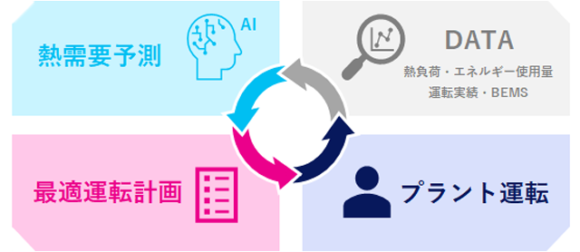 当社では、AI・IT技術を活用し、熱供給プラントの運転を高度化する取り組みを進めています。データとAIによる支援で最適運転を実現し、将来的には高度な自動化をめざします。